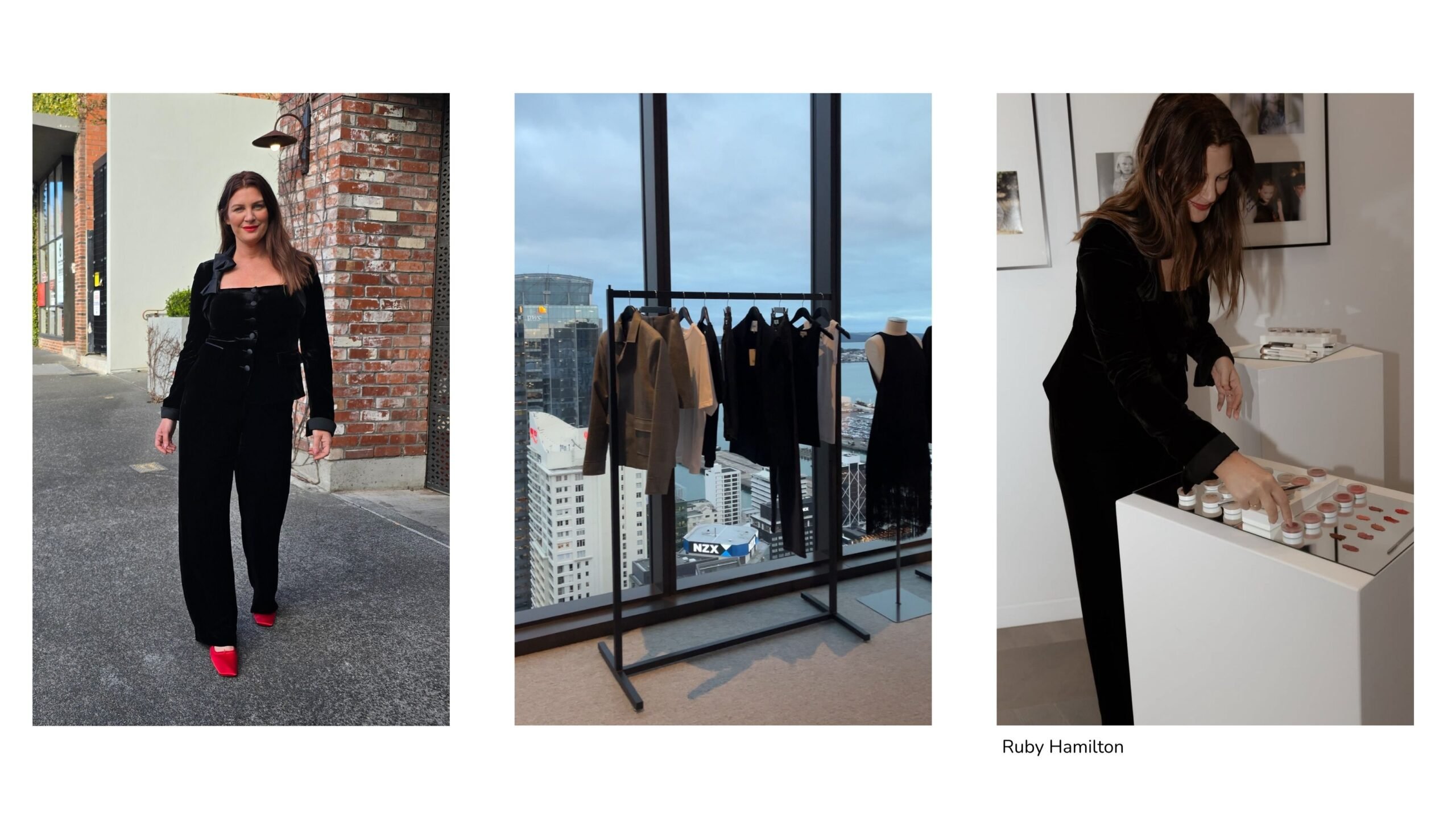 What I wore: A black vintage Armani velvet suit, red statement shoes, and Aleph’s ‘Gloria’ Cheek/Lip Tint for the perfect pop of bold colour.